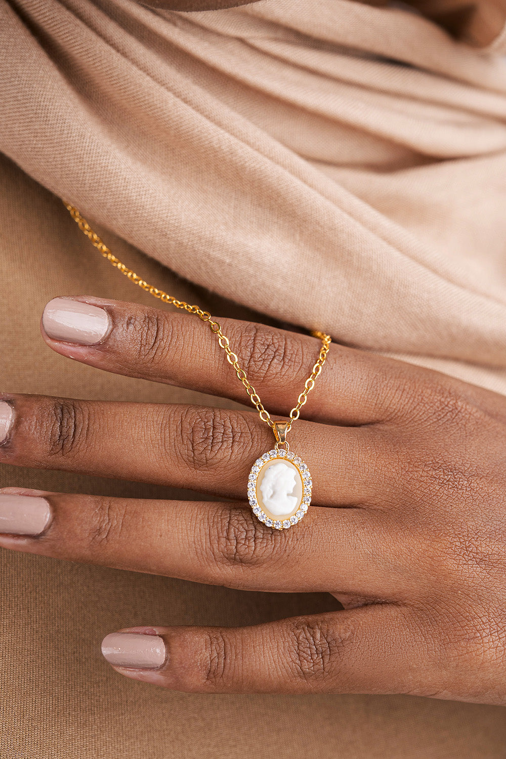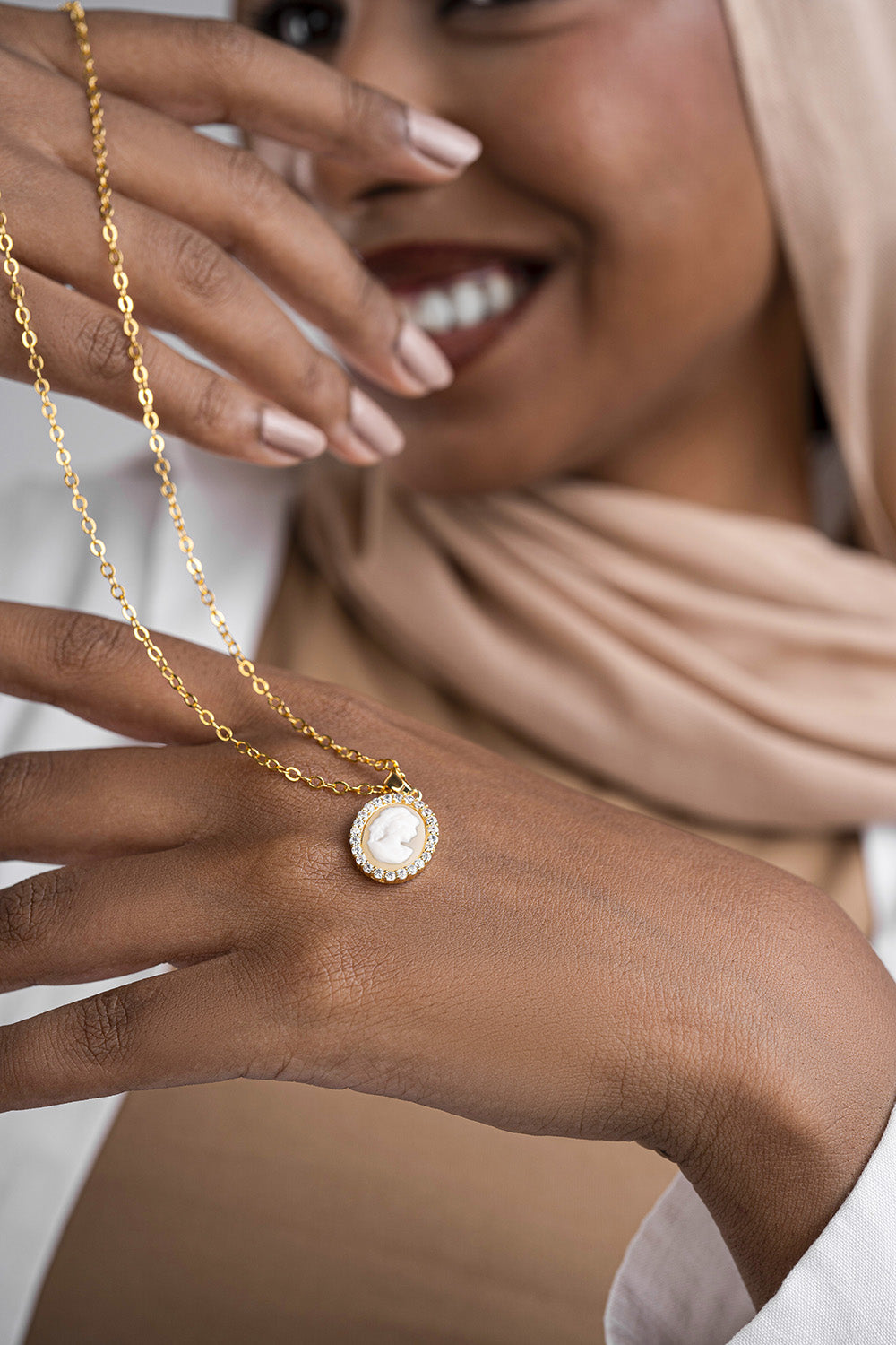 استمتع بأناقة كلاسيكية مع سلسلة الكاميو المذهلة. تتميز هذه السلسلة بتصميم بورتريه فني محفور داخل إطار ذهبي فاخر ومرصع بأحجار براقة تضيف لمسة من الفخامة. السلسلة مثالية للاستخدام اليومي أو لإضافة لمسة من الجاذبية إلى أي إطلالة رسمية. اختاريها الآن لتكون قطعة مميزة في مجموعتك!